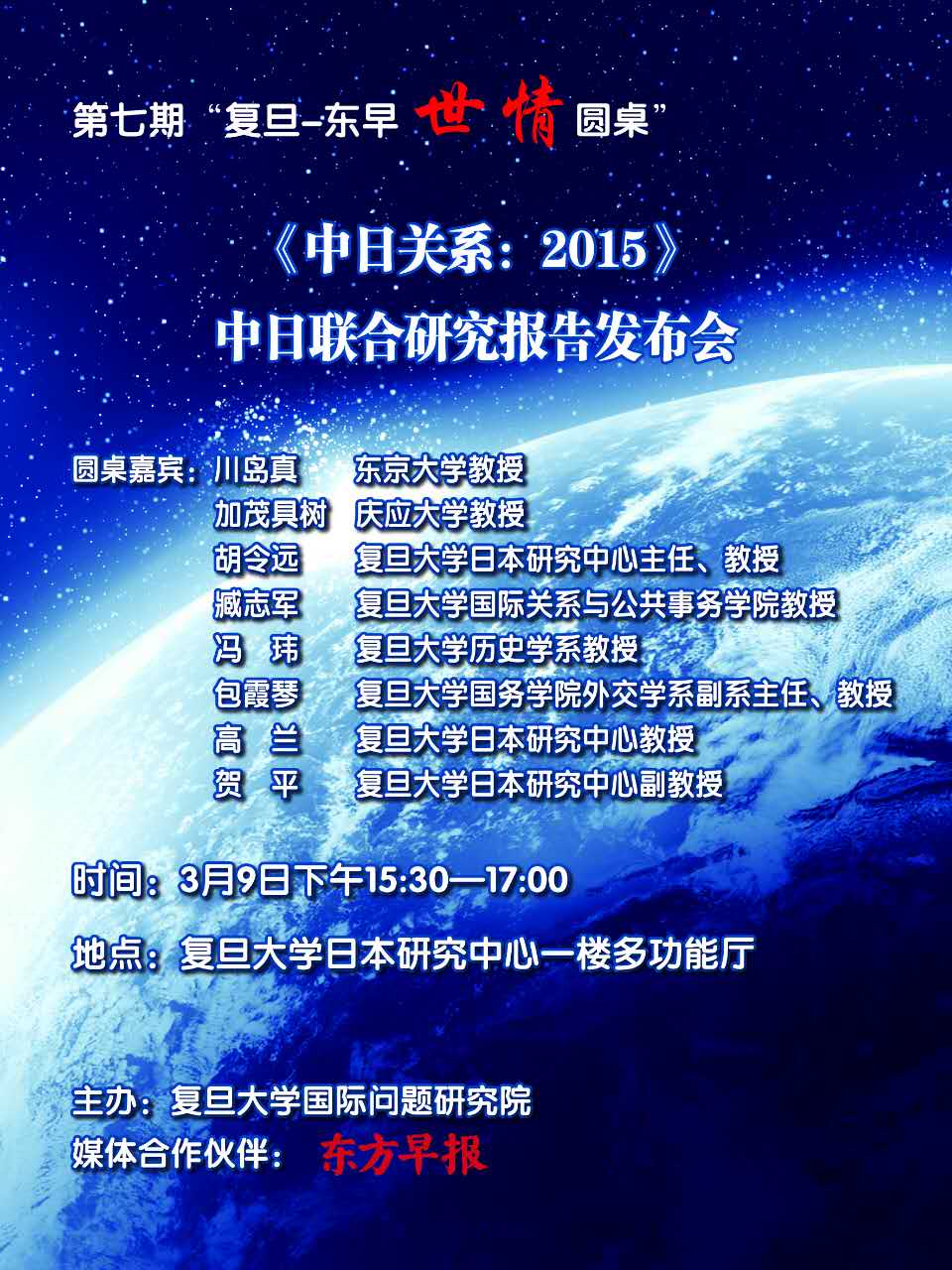 2016年3月9日,复旦大学国际问题研究院在日本研究中心发布《中日关系:2015年》战略报告。复旦大学国际问题研究院常务副院长吴心伯教授主持了发布会,日本研究中心主任胡令远教授、东京大学川岛真教授分别作为课题组协调人就课题经纬作了说明,课题组成员依次介绍了各个章节的内容。