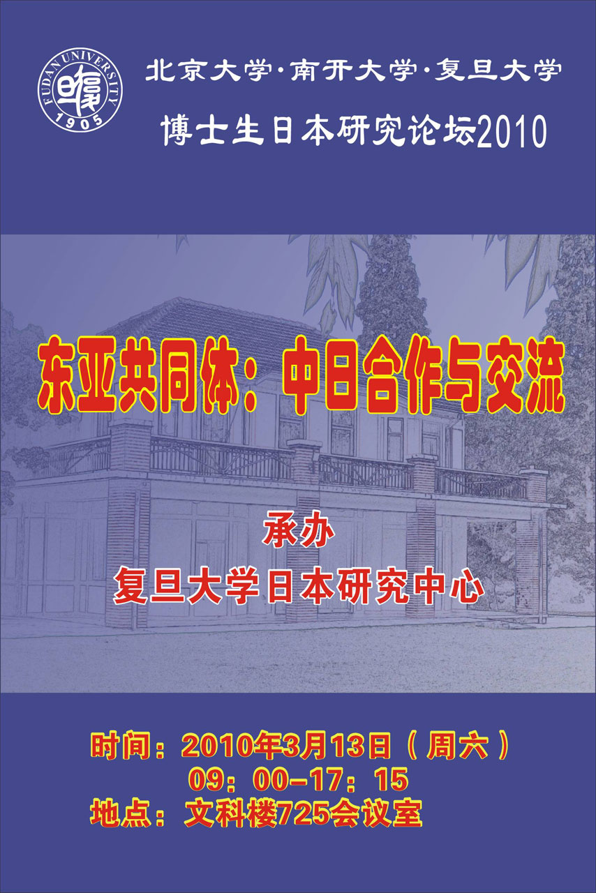2010年3月13日,由中心、北京大学现代日本研究中心、南开大学日本研究院共同举办的博士生研究论坛“东亚共同体:中日合作与交流”在复旦大学举行。