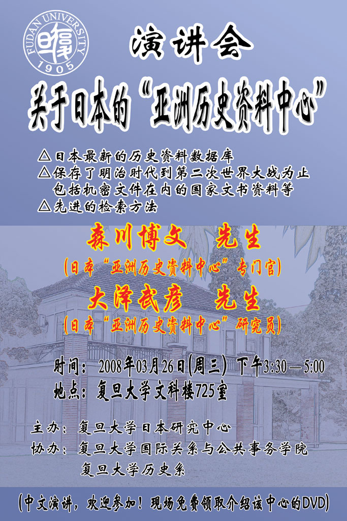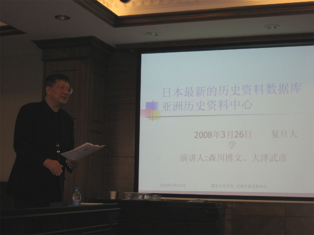 2008年3月26日,日本亚洲历史资料中心专门官森川博文、研究员大泽武彦来访,并举办演讲,向复旦师生介绍了日本亚洲历史资料中心。