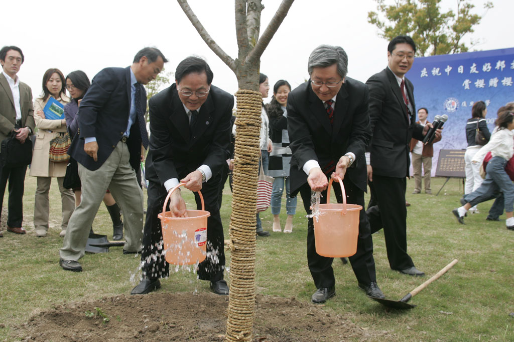 由庆应大学三田会上海分会赠送给复旦大学的35株樱花树,在所有与会的中日人士和师生手中,通过一锹一锹的铲土,一点一点的浇灌,植入了复旦江湾校区的土壤中。