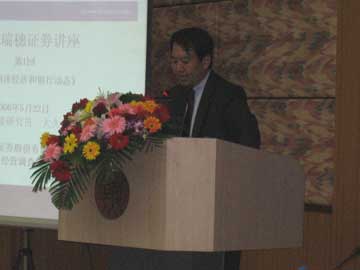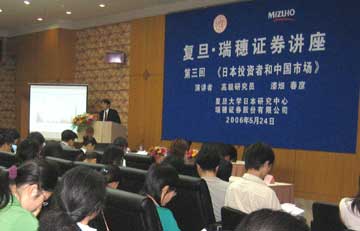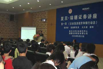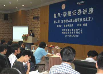 由复旦大学日本研究中心和日本瑞穗证券股份公司联合主办的“复旦-瑞穗证券讲座(2006)”于5月22—24日在逸夫科技楼2楼讲演厅开讲。今年,日本瑞穗证券股份公司又从日本总公司派遣3名资深高级研究员来到复旦,为复旦的师生专场诠释日本的经济、资本市场和投资家等课题。