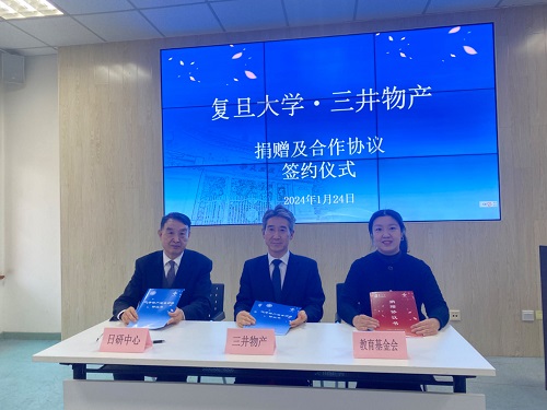 为支持复旦大学教育事业的发展,促进中日两国人文交流,经双方友好磋商,复旦大学与三井物产(上海)贸易有限公司就“复旦大学·三井物产冠名讲座”项目正式达成三年续签意向,并于2024年1月24日在复旦大学日本研究中心举办捐赠及合作协议签约仪式。