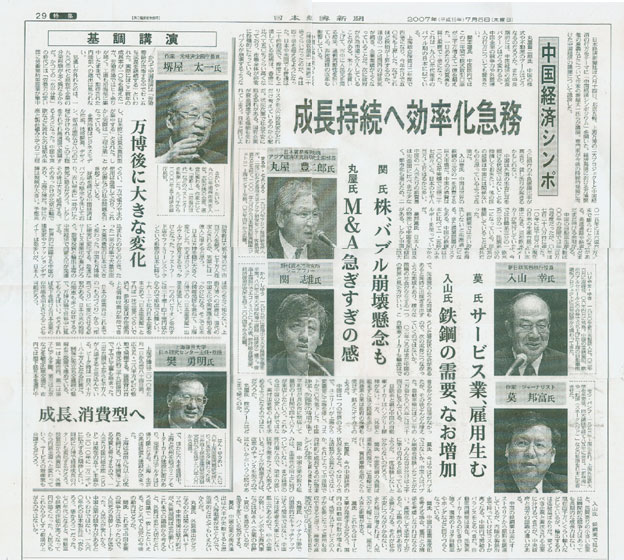 2007年7月5日,日本经济新闻在第29版整版刊载了在上月举行的“中国经济论坛”中,主要专家学者的发言。樊勇明主任认为“朝着成长、消费型经济发展”将是上海举办世博会的意义之一。