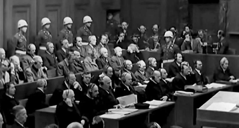 纽伦堡审判现场。 图/1945年纽伦堡审判历史影像,BRITISH PATHé历史影像档案