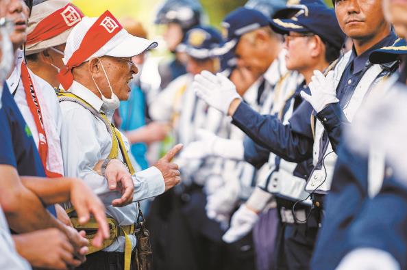 抗议政府加速军备扩充,日本民众6日在广岛和平纪念公园举行集会时与安保人员对峙 新华社 发
